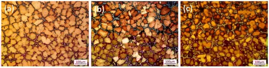 Microstructures of ZCuSn10P1 alloy at different pouring lengths at a pouring temperature of 1080 °C: (a) 200 mm; (b) 300 mm; and (c) 400 mm.