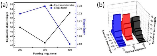 Relationship between equivalent diameter and shape factor of primary α-Cu phase with pouring length (a); and distribution of primary α-Cu phase equivalent diameter (b) at different pouring lengths of semi-solid ZCuSn10P1 alloy.