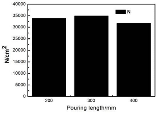 Figure 8 shows the relationship between equivalent diameter and shape factor of the primary α-Cu phase with pouring length (Figure 8a), and distribution of primary α-Cu phase equivalent diameter (Figure 8b) at different pouring lengths of semi-solid ZCuSn10P1 alloy. Figure 9 shows the relationship between the amount of primary α-Cu phase per unit area and pouring length in semi-solid ZCuSn10P1 alloy. In Figure 8 and Figure 9, it can be found that the equivalent diameter of the primary α-Cu grains was 50 μm and the shape factor was 0.72 when the casting temperature was constant at 1080 °C and the pouring length was 200 mm. The equivalent diameters are mainly in the range of 30 μm to 60 μm, but there are also some larger grain diameters exceeding 100 μm. At this point, the number of grains per square centimeter of primary α-Cu phase is about 33,939 and the solid fraction is about 63.58% after quenching. The equivalent diameter of primary α-Cu grains is 46.6 μm and the shape factor is 0.73 when the pouring length is 300 mm. The number of grains with an equivalent diameter between 20 μm and 60 μm, accounting for 83% of the total number of grains. At this point, the number per square centimeter of primary α-Cu phase grains is maximum about 34,909 and the solid fraction was 66.34% after water-quenching. The equivalent diameter of primary α-Cu phase grains increased to 53.2 μm and the shape factor decreased to 0.68 when the pouring length was 400 mm. The size of primary α-Cu phases is mainly distributed within 40 μm and 70 μm, accounting for 78.8% of the total number grains. The number per square centimeter of primary α-Cu phase grains was 31,757 and the solid fraction was 75.3% after water-quenching. The actual solid fraction calculated is much higher than the theoretical solid fraction [16,17].