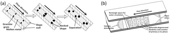 Figure 10a shows a schematic diagram of the Crystal Separation Theory [19] and Figure 10b shows the shear stress and velocity distribution of the melt during flow through the ECSC process. Many primary α-Cu phases are nucleated on the surface of the cooling plate due to the melt chilling effect when the liquid metal is poured onto a cooling slope plate [19]. The crystal nucleus and the cooling plate are detached into the interior of the solution under the action of the melt flow. The surface of the cooling slope plate forms new nuclei again so that the downstream liquid melt becomes the semi-solid slurry. Therefore, the formation of slurry is related to the temperature field and the velocity field. The cooling channel thickness of ECSC is only 5 mm, which means the temperature field and the velocity field are relatively uniform. The semi-solid slurry with equiaxed or worm-like grains is finally formed under the combined action of heterogeneous nucleation and homogeneous nucleation.