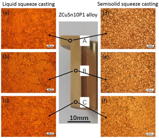 Comparison of microstructures of ZCuSn10P1 alloy parts obtained by liquid squeeze casting and semi-solid squeeze casting.