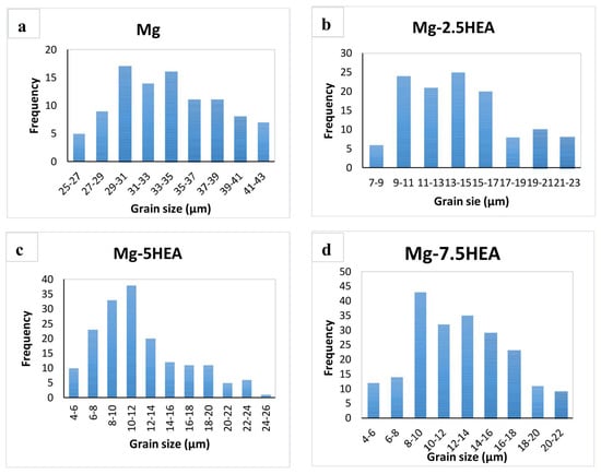 - The addition of ball-milled CCA reinforcement particles assisted in a significant refinement of the matrix grain size. The measurement on the grain size distribution showed a normal distribution in the Mg, Mg-2.5CCA, and Mg-7.5CCA composite compositions while a right-skewed distribution was observed in the Mg-5CCA composite.