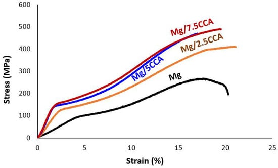 | Mg-7.5 wt % CCA (4.9 vol %) | 148 ± 4 (63%) | 472 ± 19 (79%) | 15 ± 2 |