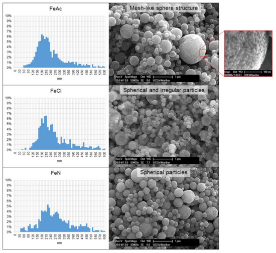 In the first step, iron-containing precursors were used with USP, in order to understand the morphologies and synthesis mechanisms of Fe oxide particles that are formed inside the USP better. Three precursors were used for this purpose: iron (II) acetate (Fe(C2H3O2)2), iron (III) chloride hexahydrate (FeCl3 × 6H2O) and iron (III) nitrate nonahydrate (Fe(NO3)3 × 9H2O). The same USP parameters (reaction temperature, ultrasound frequency, gas flow) were chosen for all three precursor types for a direct comparison of the resulting Fe particle morphology. TGA was done on the precursors in order to select a reaction temperature inside the USP, ensuring Fe oxide particle synthesis. The following temperatures are needed for total thermal decomposition of the precursor salts: iron acetate (labelled FeAc) 275.45 °C, iron chloride (labelled FeCl) 463.36 °C and iron nitrate (labelled FeN) 175.68 °C. A temperature of 600 °C ensures that the synthesis of all three precursors would result successfully in the formation of Fe oxide particles, with ample reaction time (about 19.4 s inside the first two heating zones) for complete decomposition of the precursors inside the USP reaction zone. From the three precursors, three distinctive Fe oxide particle shapes have been formed inside the USP (Figure 1). Table 2 shows the measured sizes of the obtained particles. In Figure 1, the size distributions are shown only up to 600 nm, as the number of particles above this size is below 5% (percentage of particles above 600 nm: FeAc 2.95%, FeCl 3.37% and FeN 4.14%). The size of particles synthesized with USP is dependent mainly on the aerosol droplet size, precursor solution density, viscosity and surface tension and precursor salt concentration [20,21]. Since all three experiments had the same ultrasonic generator with the precursor solution physical properties similar to water, with the same low salt concentration, the measured particle sizes were similar between the three experiments. The mean size values between the experiments did not differ by much (about 261 nm for FeAc, 283 nm for FeCl and 296 nm for FeN), as seen in Table 2.