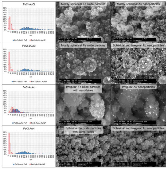 The resulting Fe/Au particles’ sizes and morphologies are seen in Figure 3. A more detailed view of the Au nanoparticle morphologies is seen in Figure 5. Table 3 contains the size values of the corresponding produced particles. Figure 4 shows a representative EDX analysis of the hybrid bimetallic Fe/Au particles, where the Fe oxide particles and AuNPs are identified.