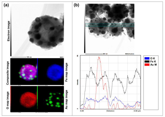 EDX analysis confirmed that AuNPs are on Fe oxide sub-micron sized particles: (a) EDX mapping analysis of a Fe/Au particle from the experiment on FeCl-AuCl; (b) EDX line analysis of Fe/Au particles from the experiment on FeCl-2AuCl.