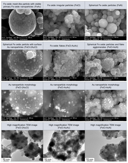 The FeCl-AuCl precursor produced mostly spherical and some irregular Fe oxide particles with a mean size of 323 nm. Gold spherical nanoparticles with some irregularly-shaped nanoparticles with a mean size of 28 nm were on the Fe oxide nano- and submicron-particles. The mechanisms for precipitation of AuNPs across the volume of larger oxide particles are explained in a previous publication [22]. In those experiments, it was shown that Au precipitated inside the volume and on the surface of TiO2 submicron particles. In our investigation, it is not proven yet if the same synthesis mechanisms have taken place with Fe/AuNPs. The AuNPs are spread randomly around the Fe oxide particles, as seen in SEM and TEM images (Figure 3 and Figure 4).
