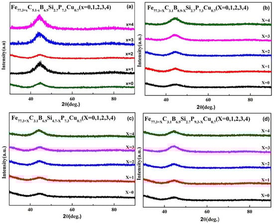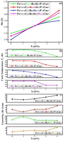 Figure 4a shows the MS measured with VSM of Fe77.3+xC5.1−xB6.9Si2.7P7.3Cu0.7, Fe77.3+xC3.1B8.9−xSi2.7P7.3Cu0.7, Fe77.3+xC3.1B6.9Si4.7−xP7.3Cu0.7, and Fe77.3+xC3.1B6.9Si2.7P9.3−xCu0.7 (X = 0, 2 and 4) amorphous as-spun ribbons, respectively. When the content of metalloid elements is decreased, MS has an increasing trend for all as-prepared ribbons. Specifically, the MS increases gradually from 1.45 T to 1.58 T, 1.43 T to 1.63 T, 1.40 T to1.55 T, and 1.43 T to 1.61 T when the content of C, B, Si and P is decreased. Due to the large negative mixing heat between Fe and metalloid elements, the addition of metalloid elements tends to generate Fe-metalloid atomic pairs. It should consider the electron interactions of Fe and metalloid elements. For C, B, Si, P elements, which all have p electrons, the p orbitals interact with 3d electrons of Fe, which would lead to the reduction of the effective magneton number. As a result, with the addition of metalloid elements, the saturated magnetization tends to be decreased, which is consistent with previous work [,].
