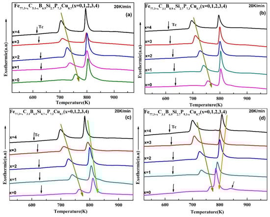 Figure 4b shows the composition dependence of Curie temperature for all investigated FeCBSiPCu MGs. As can be seen in Figure 4b, each curve shows a decline trend, indicating that the Curie temperature declines gradually by decreasing metalloid elements. For Fe77.3+xC3.1B8.9−xSi2.7P7.3Cu0.7 (X = 0, 1, 2, 3, 4) alloys, the TC shifts from 632 to 601 K, which is the maximum decrease compared with that of adjusting C, Si, and P contents. It is obvious that all curves have plateaus, especially for Fe77.3+xC3.1B6.9Si2.7P9.3−xCu0.7 (X = 0, 1, 2, 3, 4) alloys; the Curie temperature even keeps as a constant value when P content is more than 7.3%, indicating that effects of metalloid elements on Curie temperature of FeCBSiPCu amorphous alloys are not remarkable if the content of metalloid elements reach to relative high value. According to molecular field theory, Curie temperature is proportional to exchange-integral constant A, which is affected by type of alloying element and distance between magnetic element. For FeCBSiPCu amorphous alloys, exchange-integral constant A is only related to Fe-Fe interaction, since there exists only one type of magnetic element Fe in FeCBSiPCu alloy system. For FeCBSiPCu amorphous alloys, AFe-Fe increases, since the addition of metalloid elements such as C, B, Si, and P increases distance between two Fe atoms, which results in the increasing of Curie temperature.