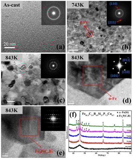 TEM images for Fe81.3C3.1B4.9Si2.7P7.3Cu0.7 alloys of as-cast (a), annealed at 743 K (b), and annealed at 843 K (c) for 10 min; HRTEM images for Fe81.3C3.1B4.9Si2.7P7.3Cu0.7 alloy annealed at 843 K for 10 min (d,e) and XRD patterns of Fe81.3C3.1B4.9Si2.7P7.3Cu0.7 alloy as-cast and annealed at different temperatures (f).