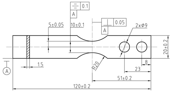 The specimen is made of Ti–6Al–4V with ultimate strength of 1005 MPa, yield strength of 910 MPa, Young’s modulus of 114 GPa, Poisson’s ratio of 0.34, and density of 4420 kg/m3. As shown in Figure 1, the beam specimen used is 120 mm × 20 mm × 1.5 mm. The minimum width in the center is 10 mm and both lateral faces of the arcs are polished by sandpaper (number 240, 600, 1000, and 2000, successively).