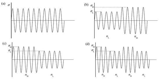 Schematics of (a) constant amplitude loading; (b) low-high loading; (c) high-low loading; (d) two-level repeated block loading.