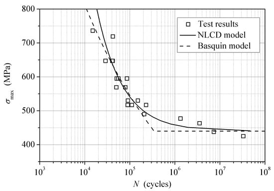 where a and b are material parameters. The parameters of Basquin model and NLCD model are obtained as a = 3995, b = −0.173, M0β/H =2.75 × 104, and β = 0.03781. The calculated and the tested S-N curves are overlaid in Figure 4. It can be seen that these two models have the same predictions in the middle stress region of 500–650 MPa. Under a relative high stress level (σmax > 650 MPa), the Basquin model gives a shorter fatigue life than the NLCD, but the relative errors of the two models from the experimental data are similar. In the low stress range under 500 MPa, the NLCD shows a competitive performance in particular when the load is close to the fatigue limit. Near the fatigue limit, the prediction of the Basquin model show a knee point while that of the NLCD model is very smooth and much closer to the experimental data.