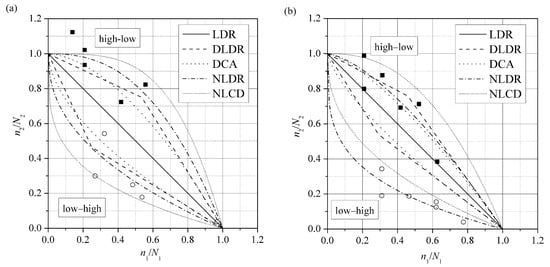 Figure 9 illustrates the experiment data for the two-level repeated block loading case, in which the fractions of damage under the higher stress level, nH/NH, are plotted against that under the lower stress level, nL/NL. In Figure 9, the LDR line is drawn for comparison. It can be seen that the damage fractions of the two-level repeated block loading cases (both the constant cyclic ratio and the constant stress difference cases) are distributed around the D = 1 line. The results indicate that the two-level repeated loading does not bring any apparent effects on the damage accumulation comparing with the one-way two-block loading cases. As discussed above, in the constant cyclic ratio cases, the damage accumulation is dominated by the higher stress level when the higher stress cycles and the lower stress cycles are similar. However, in the case of constant stress difference, the data distribution is more dispersedly throughout the range from 0 to 1. That is to say, when the cycle number of the higher load changes, the damage fractions change accordingly. The result further proves that the damage accumulation in the repeated block loading conditions strongly depends on the higher loading level.