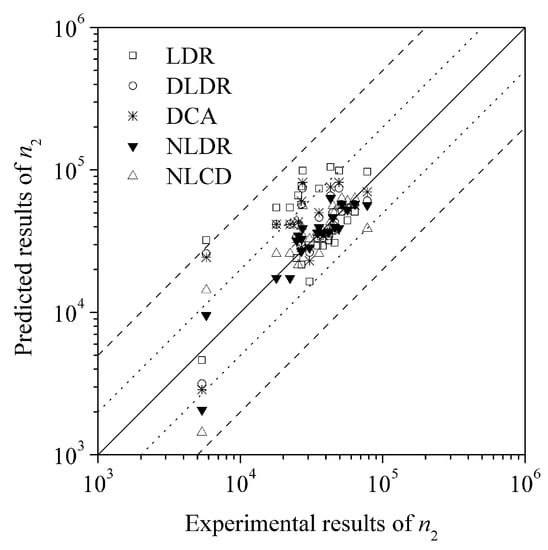 The tested damage fractions and the predicted damage accumulation curves are illustrated in Figure 6. The damage fractions caused by the second loading block (n2/N2) are plotted against that caused by the first loading block (n1/N1). In the 647/517 MPa case, the LDR gives the same diagonal for both two loading sequences, which means the sum of damage caused by the two-level load equals 1. While the results from the other four models are a series of curves below the diagonal line in the L-H (517–647 MPa) case and above the diagonal line in the H-L (647–517 MPa) case. The results show that the effect of the loading sequence on the fatigue life is not considered in the LDR model but can be considered in the other four models. The DLDR curves are actually composed of two sections representing the damage in the two fatigue phases which are very similar with the DCA. NLDR and NLCD exhibit the highest accuracies in the damage fraction prediction in this case. Similar results can be found in the 595/517 MPa case. The comparison between the experimental and the calculated results of n2/N2 are shown in Figure 7. The relative prediction errors are 92.2% (LDR), 56.9% (DLDR), 59.2% (DCA), 21.0% (NLDR), and 34.0% (NLCD), which further proves that NLDR and NLCD have better performances. It should be noticed that, to utilize the NLDR, the parameter x1/x2 is calculated for every loading condition, which is 0.44 for H-L (647–517 MPa), 2.49 for L-H (517–647 MPa), 0.27 for H-L (595–517 MPa), and 1.48 for L-H (517–595 MPa). From this point of view, the NLCD is much easier to apply with acceptable sacrifices of precision.