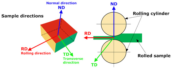 After this stage, samples for EBSD analysis and for SEM analysis were prepared differently. For EBSD analysis, the samples were further polished by vibropolishing for 10 h using a short flocked polishing pad and as polishing agent 0.02 μm colloidal silica mixed with 10% H2O2. For SEM analysis the metallographic prepared samples were etched by swabbing for 10–15 s with a mixture of 6% HNO3 + 3% HF + 91% H2O. XRD and SEM analysis were realized on different directions in a sample reference frame (Figure 1). XRD investigations were performed on the sample surfaces defined by RD (rolling direction)–TD (transverse direction), while SEM investigation were performed on the sample surfaces defined by RD–TD and RD–ND (normal direction), according to the specified sample reference frame shown in Figure 1.