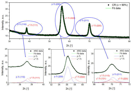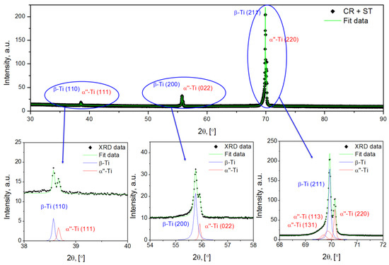 Figure 2 and Figure 3 present the XRD spectra corresponding to CR and CR+ST processed states together with detailed zooms of cumulative diffraction peaks. For CR state (Figure 2) both β-Ti and α″-Ti phases were identified. It was found that β-Ti phase shows presence of (110), (200) and (211) diffraction lines, while α″-Ti phase shows presence of (111), (022), (131), (113) and (220) diffraction lines. The β-Ti phase was indexed in Im-3m body centered cubic system, with a calculated lattice parameter of about a = 3.31 Å, while α″-Ti phase was indexed in Cmcm orthorhombic system, with calculated lattice parameters as follows: a = 3.26 Å, b = 4.74 Å and c = 4.63 Å. Considering the specific of microstructural transformations induced by deformation under a high plastic strain (equivalent plastic strain, ε = 2.42) [13,22] it can be assumed that α″-Ti phase is a stress-induced one. Also, broad β-Ti and α″-Ti peaks indicate highly distorted Ultra-Fine Crystalline (UFC)/Nanocrystalline (NC) grains because of the intense plastic deformations applied [23].