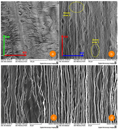 SEM micrographs of TNZF alloy in the CR microstructural state: (a) SEM micrograph in the RD–TD sample plane; (b) SEM micrograph in the RD–ND sample plane; (c) zoom area 1 of SEM micrograph in the RD–ND plane; (d) zoom area 2 of SEM micrograph in the RD–ND plane.