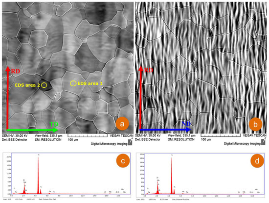 SEM micrographs of TNZF alloy in the CR+ST microstructural state: (a) SEM micrograph considering the RD–TD sample surface; (b) SEM micrograph considering the RD–ND sample surface; (c) EDS spectra of selected area 1; (d) EDS spectra of selected area 2.