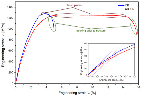 Engineering stress-strain diagrams of TNZF alloy in CR and CR+ST microstructural states.