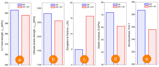 In explanation for this behavior, as evidenced by Figure 8a–e, three competitive mechanisms can be taken into consideration. The first mechanism refers to the influence of phase fractions, a higher phase fraction of a certain phase having a higher influence upon properties. In this case, it is known that α″-Ti phase exhibits much lower mechanical properties in comparison with parent β-Ti phase [34,35]. In this study, a higher α″-Ti phase fraction in CR+ST state in comparison with CR state can be evaluated due to much intense α″-Ti peaks in comparison with β-Ti peaks obtained in the case of CR+ST state (Figure 3) versus CR state (Figure 2).