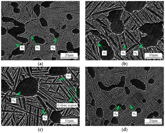 The microstructures of the alloy after different heat treatment routes are shown in Figure 1. After FSH and SSH, the microstructure consists of αp, αs and transformed β matrix with αt and residual β phase, which is tri-modal microstructure (see Figure 1a–c for S1, S2 and S3, respectively). The bi-modal microstructure consisting of αp and transformed β matrix is achieved for S4 (see Figure 1d).