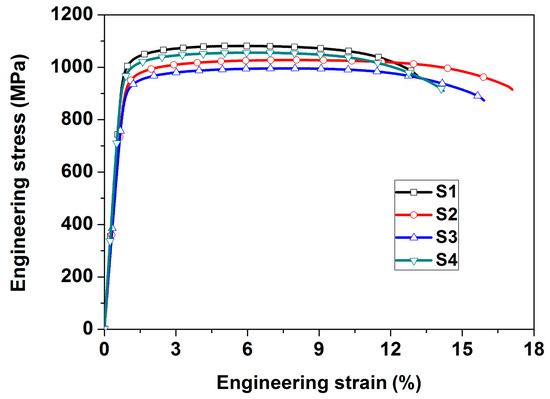 The engineering stress-strain curves of TA15 alloy after different heat treatment routes are displayed in Figure 5 and the macroscopic properties are given in Table 3. It is obvious from Figure 5 and Table 3 that the UTS of the alloy increases from about 995 MPa (sample S3) to 1080 MPa (sample S1) with increasing SSH temperature and the UTS of S4 is 1055 MPa between that of S1 and S2. The elongation of alloy basically has an opposite variation rule with UTS. The sample S1 has lowest elongation (13.1%) and S4 has an intermediate elongation (14.2%). However, the sample S2 have both higher UTS (1025 MPa) and elongation (17.1%) as compared to S3. The variation of UTS and elongation is caused by the difference of microstructural constituents and is further investigated in the next sections.