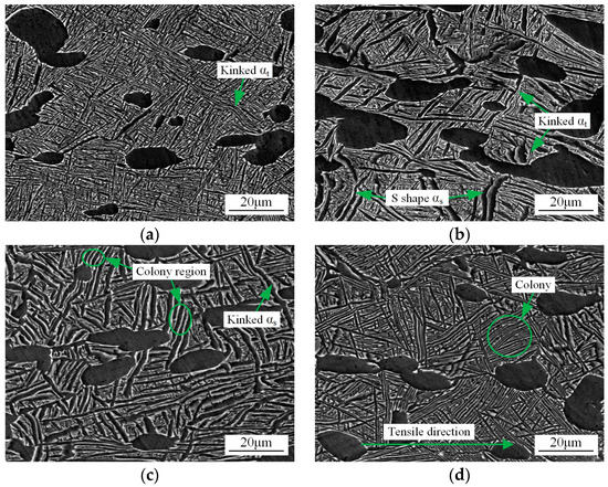The ductility of the alloy is mainly determined by the deformation amount of microstructural constituents. The deformation amount of microstructural constituents can be analyzed by the microstructures closed to the fracture surface as presented in Figure 6. The αp particles are elongated in the direction parallel to the tensile direction and the αs and αt plates are kinked in the deformed microstructures of the four samples. Although the deformation mode of the three α phases in the four samples is similar, their deformation amount is different. The deformation amount of αp particles can be analyzed by their aspect ratio. The statistical aspect ratio of αp particles is 2.47, 2.83, 2.62 and 2.42 for S1 to S4 after tensile deformation, respectively. Therefore, the increments of aspect ratio as compared to the corresponding initial microstructure (Figure 1) are 96%, 121%, 117% and 105% for S1 to S4. Large aspect ratio increment indicates large deformation amount of αp particles. Therefore, the deformation amount of αp particles increases in the order of S1, S4, S3 and S2. The deformation amount of αs and αt plates increases with kinking degree. In sample S1, only small part of αt undergoes kinking deformation and most of αt has an inconspicuous deformation (Figure 6a). In sample S2, almost all αs plates are kinked. Some αs plates are curved to “S” shape indicating emergence of severely kinking deformation. Some αt plates in S2 also undergo obvious kink deformation, although they are generally hard to deform (Figure 6b). In sample S3, kinking deformation of αs plates occurs in some location. However, some αs plates that keep the colony morphology are relatively straight indicating a small deformation degree (Figure 6c). In sample S4, α colony deforms as a single grain [26] and each αt plates in colony have similar small deformation degree (Figure 6d). Therefore, the deformation amount of α plate region increases in the order of S1, S4, S3 and S2. The deformation amount order of α plates is consistent with that of αp particles, since these microstructural constituents should deform compatibly during the deformation of alloy.