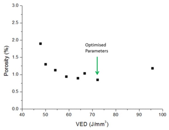 The overall effect of the building parameters on the porosity was studied by the Volumetric Energy Density (VED) parameter which obeys to the following equation: