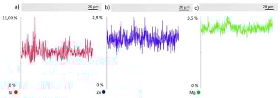 In order to assess the homogeneity of LPBF parts produced from mixed powders, EDX measurements were carried out on the cross section of samples built with the optimized parameters. The EDX lines revealed that a homogeneous distribution of the reinforcing elements throughout the melt pool can be achieved (Figure 4). The thermophysical phenomena that arise in the melt pool produce the homogeneous dispersion of most of the alloying elements and therefore the formation of the 50% 7075 alloy starting from AlSi10Mg + 7075 powder mixture. However, it must be pointed out that the chemical composition of the alloy measured with EDX analyses revealed that, because of the high temperatures reached in the melt pool, part of the Zn evaporates (Table 3).