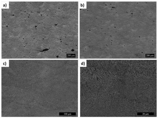 The optical micrographs of 50% 7075 etched samples, reported in Figure 5, reveal that their microstructure is constituted by the interconnection of multiple melt pools as in the case of the AlSi10Mg samples []. A sample was built without the rotating scanning strategy in order to analyze the shape of the melt pools for this alloy (Figure 5a). The comparison of this image with a micrograph of a sample built with the rotation (Figure 5b) clearly shows the advantages that the scanning strategy brings to the densification. The samples built without the 67° rotated scanning strategy is characterized by irregular pores that suggest a poor melt pool interconnection due to a repetitive scanning strategy. Furthermore, Figure 5b,c shows that the melt pools are characterized by areas with different cells size and shape. The melt pool center contains fine and equiaxed cells while elongated cells are present at the melt pool boundaries.