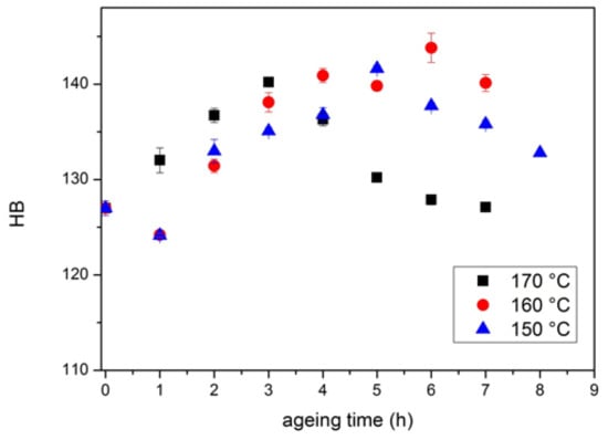 Since previous works suggested that LPBF aluminum alloys in the as-built state can be considered as supersaturated solid solutions [,], the effect of a direct ageing on the phase composition and the mechanical properties was investigated by XRD measurements, hardness and tensile tests. Figure 7 reports the Brinell hardness trend with the ageing time of 50% 7075 LPBF samples and clearly shows that the direct ageing strongly increases the mechanical properties of this alloy, suggesting that some precipitation arises. The highest hardness values were achieved by ageing the samples for 6 h at 160 °C. The Brinell hardness value of the stress relived 50% 7075 was 65.0 HB and has not been reported in the graph.