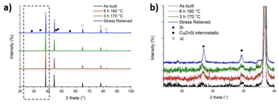 The XRD patterns of 50% 7075 sample in different conditions, reported in Figure 8, confirm that this alloy in the as-built state is mainly constituted by Al and reveal that the stress relieving and the ageing heat treatments favor the precipitation of silicon and some intermetallic phase (Figure 8b). It must be pointed out that, notwithstanding the longer heat treatment time, because of the lower temperature, a smaller precipitation arises during samples’ ageing than during stress relieving. The intermetallic peaks that were also identified in the pattern of the as-built sample suggest that part of the alloying elements precipitates during the building process.