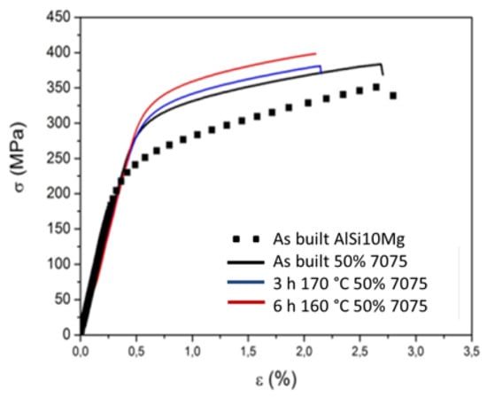 Tensile curves of 50% 7075 samples in the as-built state and aged in different conditions compared with the AlSi10Mg one in the as-built state.