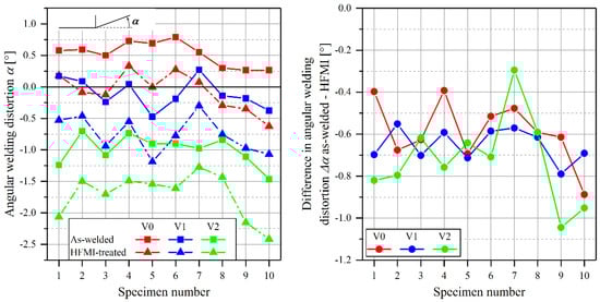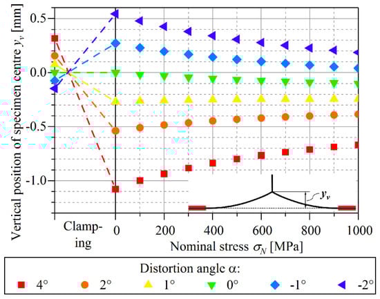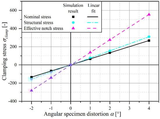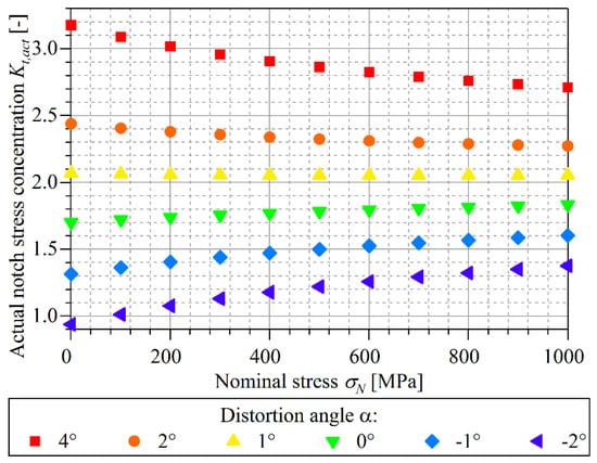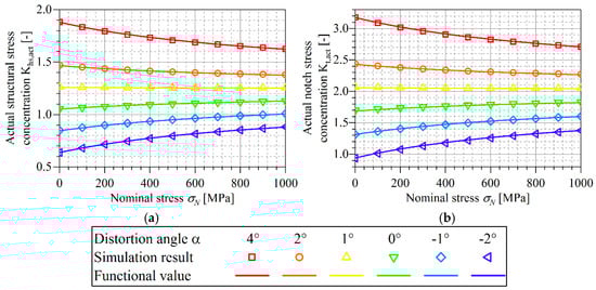 Figure 14 provides a graphical representation of the course of the actual stress concentration factor for the effective notch stress with increasing nominal load and angular distortion. Here, the already described additional bending in case of the non-distorted specimen is clearly visible. In case of the model exhibiting one degree of angular distortion, the two mentioned effects apparently counteract each other leading to a curve almost independent of the nominal stress. A similar tendency is observed in