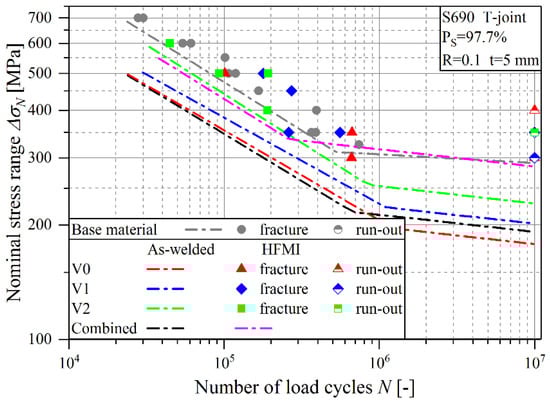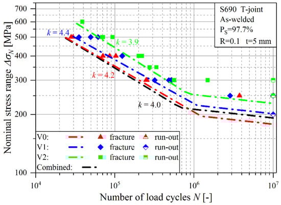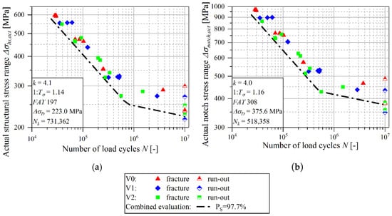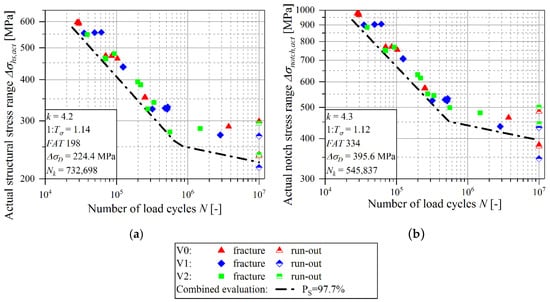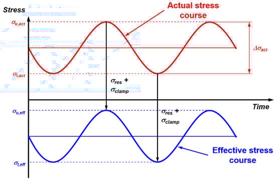 This relationship of the stress concentration at the weld toe with increasing nominal load does not allow a direct application of Equation (7) for stress ranges. Here, the calculation of the respective actual upper and lower stresses