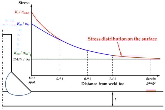 39] is used within the fatigue assessment. Hereby, quadratic extrapolation following Equation (2) is applied, which fits to the spatial finite element models and mesh properties: