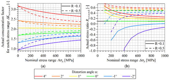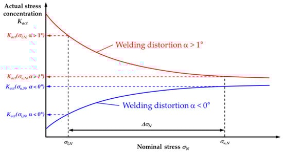 Kact is introduced describing the ratio between the actual and the nominal stress range; see Equation (11). This parameter is of special interest as it shows the effect of the weld detail with its angular distortion and the nominal stress ratio on the nominal stress range. In this context,