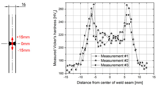 As aforementioned, the fatigue models by Murakami [33], De Kazinczy [39], and Mitchell [43] consider the local hardness as material parameter. Therefore, Vicker’s hardness HV5 measurements are performed at one lateral edge of the samples. Figure 2 illustrates the measurement paths from the center of the weld seam at the lateral edge of the specimen and the hardness values for three samples of test series √area < 1000 µm. The gas pores occur at the middle of the specimens within the weld metal in a distance of about −2.5 mm up to 2.5 mm to the center of the weld seam at 0 mm. Herein, the average Vicker’s hardness is measured as about 215 HV5. A similar approach is applied for the welded samples of test series √area > 1000 µm leading to a mean hardness value of 150 HV5. This hardness difference mostly arises due to the differently applied weld process parameters.