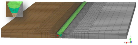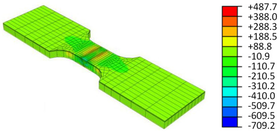 The numerical model, which is set-up for a structural weld simulation in case of the test series √area > 1000 µm, is presented in Figure 3. Thereby, the weld simulation is modeled in accordance to the real weld procedure including three single-sided weld passes; see left subfigure in Figure 3. Details to the applied material data, boundary conditions, as well as weld process parameters are provided in [30,47]. After structural weld simulation, the final specimen geometry is numerically cut-out of the weld array by eliminating the remaining elements in the model and the local residual stress state in the mid area of the sample, where the gas pores are located, is analyzed. Figure 4 demonstrates the residual stress condition in axial direction of the specimen, which shows values of around zero within the imperfected weld seam area. This comparably minor residual stress state can be explained by the single-sided three-pass weld procedure, which is significantly different to the double-sided two-pass welding in case of the test series √area < 1000 µm, leading to a local tempering of the central weld seam region due to the last weld pass at the top.