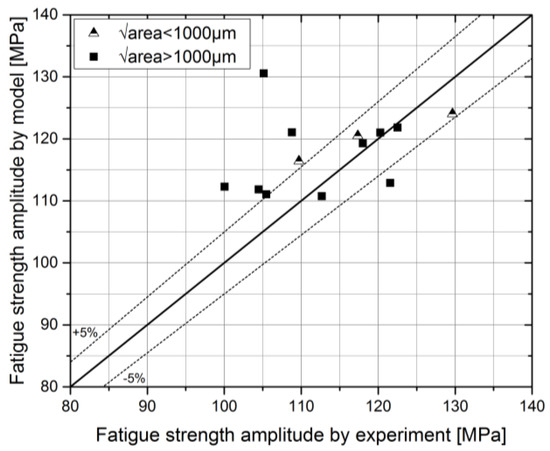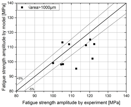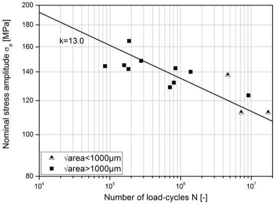 A comparison of the mean deviation by focusing on the incorporated analytical fatigue models with the experimental results is provided in Table 6. Herein, it is shown that the fatigue model by Murakami [33] is well applicable in case of imperfections exhibiting √area < 1000 µm with an average deviation of only +1%. In this case, the commonly applied slope value of m = 3 is utilized. To assess the fatigue strength of the gas pores with √area > 1000 µm, this value is modified to m = 4, which again demonstrates a sound conformity to the experiments with a mean overestimation of only +5%.