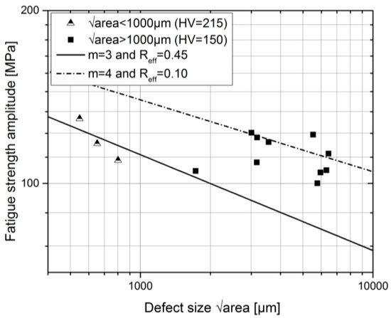 In [37,38] an overview about fatigue models for a defect tolerant design is given. Due to the basically limited validity of the concept by Murakami for only comparably small defect sizes with √area < 1000 µm, another fatigue approach by De Kazinczy [39], which is generally applicable for larger imperfections exhibiting a value of √area > 1000 µm, is introduced; see Equation (5).