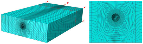 Within this section, the analytical fatigue strength model by Mitchell [43] based on Equation (6), featuring a numerical computation of the stress concentration factor Kt, is applied. Firstly, a half-symmetrical finite element model of a sample from test series √area > 1000 µm exhibiting a spherically shaped gas pore with a pore diameter of 1.95 mm in the middle of the cross section, is set-up; see Figure 11. The specimen is fixed at the clamping area C and the gas pore is modeled at the axial symmetry plane S in the front, which equals the boundary conditions for the samples at the fatigue tests. Linear-elastic material behavior with a Young’s modulus of 2.1 GPa and a Poisson’s ratio of ν = 0.3 for mild steel is used for the whole model. As no elastic-plastic analysis is required to evaluate Kt, a material mismatch within the welded zone is not considered. A structured, fine mesh, with an element size and type, according to a previous study [52], is utilized to accurately compute the local stress condition. A uniformly distributed tensile load of P = 1 MPa is applied at the rear surface to directly evaluate the stress concentration factor Kt by the numerical analysis.