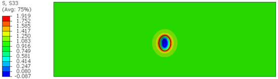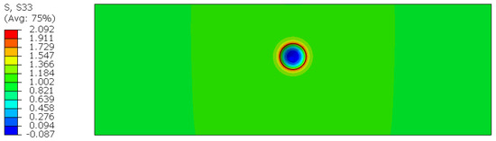 Figure 12 represents the stress value S33 in axial direction of the specimen as result of the numerical computation. It is shown that the stress concentration factor exhibits a value of Kt = 2.09, which is located around the edge of the spherical imperfection. The numerical result is in sound accordance to the analytical calculation based on Equation (7), which leads to a value of Kt = 2.05. Hence, the numerical model is well suitable to properly evaluate Kt for this comparably simple pore geometry, but it is also capable of computing stress concentrations for more complexly shaped imperfections.