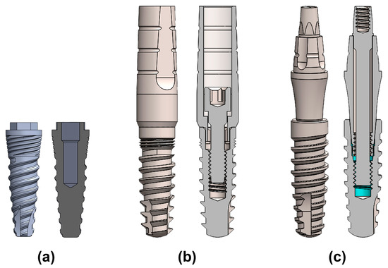 Nowadays, a vast number of implant designs are available. The first dental implants had an external connection, where the hexagonal anti-rotational component is the most common design. Figure 1a shows an example of this connection. Due to the high rate of rejected implants, a new connection was designed. In this case, internal connection (Figure 1b) allowed a better union between the implant and the abutment. Finally, morse taper connection (Figure 1c), which is another option for an internal connection, was introduced because of its improvement on screw loosening [14,15,16].
