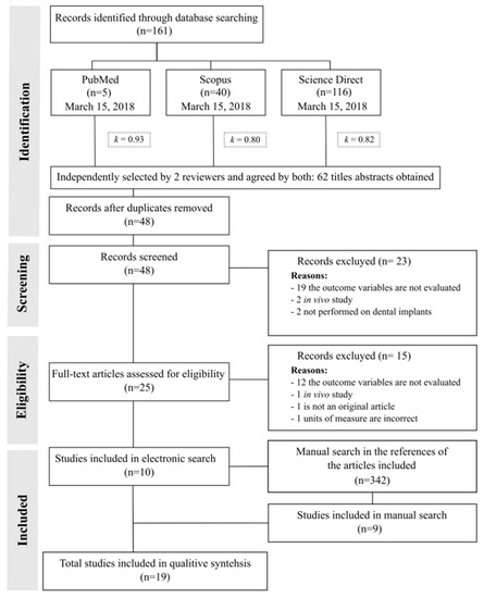 Figure 2 shows a flowchart of the study selection. All electronic search strategies provided 161 potential articles. Two of the authors (Rosa Rojo and María Prados-Privado) independently identified 48 eligible documents. The general agreement of eligibility of the studies between the authors was high (k = 0.87; p = 0.049.) Specifically, agreement between authors on the selection of articles in each considered database was high for all of them: Medline/PubMed (k = 0.93; p = 0.046), Scopus (k = 0.80; p = 0.043), and Science Direct (k = 0.82; p = 0.05). A total of 38 studies were excluded because they did not meet the defined inclusion criteria. Additionally, a manual search has been carried out to analyze the references cited in 10 of the articles that were included in this work. We reviewed 342 references. After removing duplicates, we analyzed the titles, abstracts and, when required, the full-text from 272 citations. A total of 263 studies were excluded as they did not match the inclusion criteria. As a result, nine additional articles were incorporated from the manual search. Finally, a total of nineteen in vitro studies were analyzed.