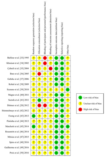 Using the evaluation of the seven domains for risk of bias it was determined that five had a high risk of bias [20,33,34,35,36], 14 an unclear risk [37,38,39,40,41,42,43,44,45,46,47,48,49,50], and none had a low risk of bias. Figure 3 shows a detailed description of the risk assessment of bias in the included studies.