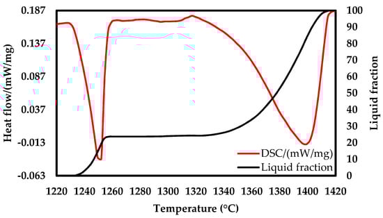 The temperatures of liquidus and solidus, in addition to liquid fraction, were estimated by carrying out differential scanning calorimetry test (DSC). Small pieces samples (less than 20 mg) were cut from the as-received material for testing with The Netzsch-STA 449 F3 simultaneous thermogravimeter (TGA-DSC) (STA 449F3, NETZSCH, Bavaria, Germany). The samples were heated at a rate of 10 °C/min in nitrogen atmosphere to prevent oxidation. The common tangent procedure is adopted to estimate the liquid fraction. Finding out the fraction of liquid was done by integrating of partial areas under the heating curves as shown in Figure 2.