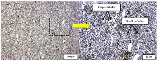 The microstructure of as-received AISI D2 consists of ferritic matrix parallel to working direction in which different surplus of large-coarse and fine carbides are distributed as shown in Figure 5. The revealed microstructure refers to annealed tool steel [] and indicates that the heat treatment was carried out as recommended. The optical microscopy examination performed on the welded joints at various conditions is shown in Figure 6. From the complete weld section at 1250 °C heating temperature with 0, 5 and 10 min holding time, large gap can been seen and big cracks at the joint interface can be observed. With the increase of welding temperature to 1275 °C with 0 and 5 min holding time, a series of cracks resulted and the weld seam could not be well joined, as shown in Figure 6S4,S5. In addition, big fractures across the entire joint were shown with little and local interactions were lactated at different zones in the interface resulting in spontaneous fracture after joining. However, when the holding time is adequate (10 min) the weldability is relatively good and there is no macroscopic voids and fractures across the entire joint which is occupied by eutectic liquid, as shown in Figure 6S6. Meanwhile, by further increasing the welding temperature to 1300 °C, strong thixojoint can be produced. Further, fine and small boundary can be observed as transition zone between two alloys. No presence of porosity and micro-cracking at this zone and the joint shape was smooth and not corrugated, as shown in Figure 6S7–S9. The thixoweld joint was characterised by visible full penetration that indicate perfect thixojoning between base blank and the insert along the bounding border. Higher amount of the interfacial reactions has been produced between two base metals []. The structure is distinguished by two features that can be determined by grain direction, as illustrated in arrows direction in Figure 7. The direction of the grains are in bands in the forming direction and as a single pin of AISI D2 was inserted perpendicular into a base blank of AISI D2 to illustrate two distinct features. The interfacial reactions during heating have accelerated the diffusion of elements through the interface and propagated the eutectic liquid across the joined surfaces that resulted in good thixojoint of the interface at both side of steels.