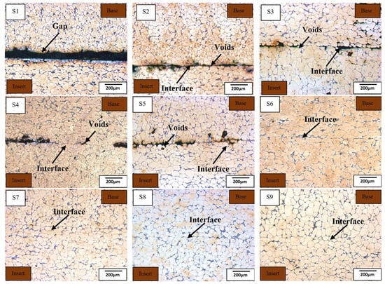 Microstructure of the thixojoined samples processed at different conditions: (S1) 1250 °C/0 min, (S2) 1250 C/5 min, (S3) 1250 °C/10 min, (S4) 1275 °C/0 min, (S5) 1275 °C/5 min, (S6) 1275 °C/10 min, (S7) 1300 °C/0 min, (S8) 1300 °C/5 min, (S9) 1300 °C/10 min.